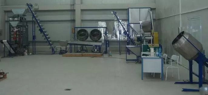Сырье (кукурузная крупа) увлажняется в смесителе перед экструдированием. Далее сырье оператором подается в загрузочный бункер экструдера. На выходе из экструдера имеем полуфабрикат – кукурузная палочка. Пневмотранспортом автоматически полуфабрикат подается в накопительный бункер. Из бункера посредством вибродозатора палочка поступает в ковшевой транспортер который подает палочку в конус взвешивающего устройства. Когда необходимая доза в конусе набирается тензодатчик посылает сигнал остановить привод вибродозатора и подающего транспортера. Контролируемая доза (использование весового устройства) необходима для соблюдения процентного соотношения вкусовой добавки к палочке. Перевод мерного конуса к дражираторам производится оператором вручную по направляющей.С конуса полуфабрикат высыпается в дражиратор, оператором вносится масло с помощью маслостанции и сухая вкусовая добавка. После выхода палочки из дражиратора получаем готовый продукт. Продукт поступает на горизонтальный конвейер которым подается в бункер вибродозатора. Вибродозатором продукт подается в ковшевой транспортер для подачи палочки в бункер фасовочного автомата. На выходе из фасовочного автомата имеем готовый упакованный в полимерную пленку продукт – кукурузная палочка с вкусовой добавкой. С автомата пакеты попадают на отводящий транспортер который поднимает пакеты на фасовочный стол, где их фасуют в транспортную тару.